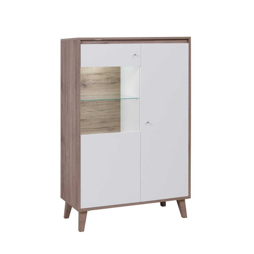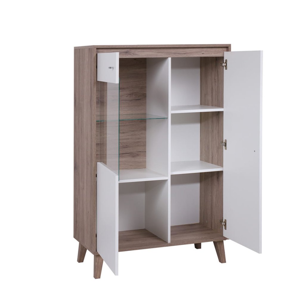 Sada se skládá ze 6 prvků: dvoudveřová skříň, vitríny , komody, TV skříňky, závěsná police a závěsná police.