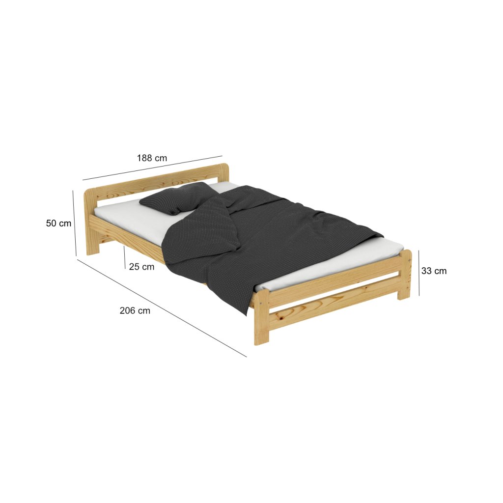 Nová postel z masivu borovice o síle 25 - 28 mm. Postele jsou lakovány dvakrát bezbarvým ekologicky a zdravotně nezávadným lakem. Postele v barevných provedeních olše, dub a ořech, jsou napřed mořeny ve výše zmíněných odstínech a následně dvakrát lakovány průhledným lakem. Barevná provedení naleznete zvlášť.