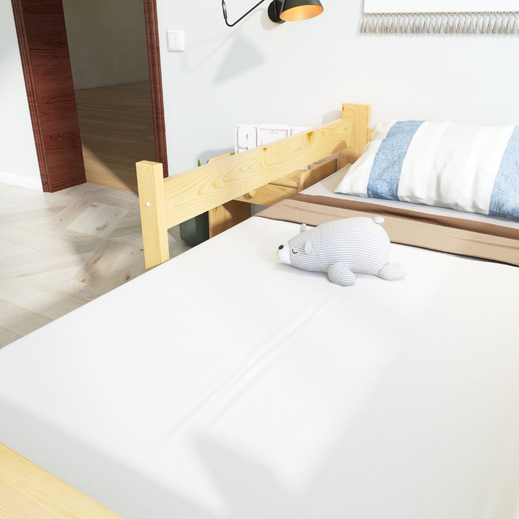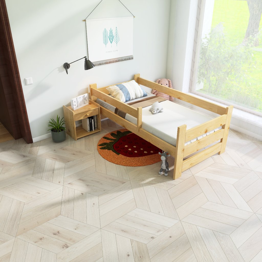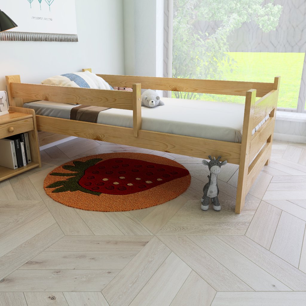 Postel pro větší děti s ochrannou bariérkou, která chrání dítě před pádem. Součástí postele je bariérka variabilní na libovolnou stranu. Tato postel je vyrobena z masivního borovicového dřeva. Postel je lakována nezávadným ekologickým lakem, vhodným pro styk s dítětem. Součástí je pevný a stabilní rošt tvořený z 12ti latí. Snížený práh, umožňuje používat tuto postel i pro nejmenší děti. Nosnost této postele je 80 kg.
