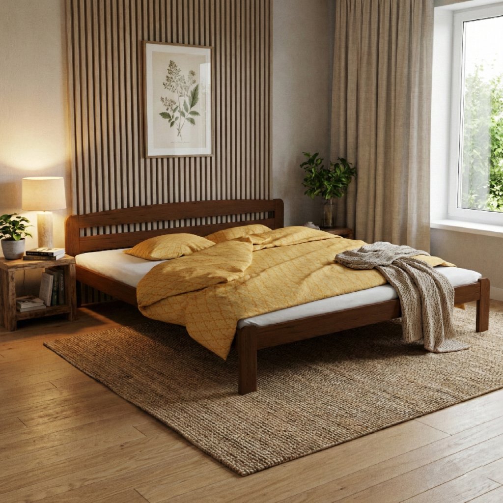 Nová postel z masivu borovice o síle 26 mm. Postele jsou lakovány dvakrát bezbarvým ekologicky a zdravotně nezávadným lakem. Lůžka jsou ručně barvená, broušená a znovu lakovaná, pouze tento postup zaručí požadovaný konečný výsledek . Postel vypadá dokonale a zachovává si svou původní strukturu. Postele v barevných provedeních olše, dub a ořech, jsou napřed mořeny ve výše zmíněných odstínech a následně dvakrát lakovány průhledným lakem.