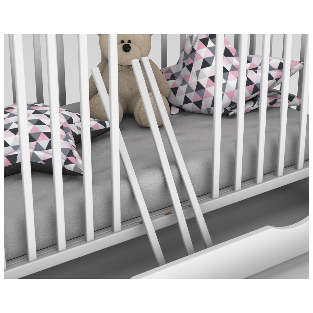 Universální postýlka 2 v 1 . Odstraněním bočnice a namontováním zpevňující výztuže, docílíte vytvoření postýlky pro starší dítě. Postýlka má tři vyjímatelné tyče, které umožní staršímu dítěti bezpečně opustit postýlku, aniž by rodiče museli mít strach, že neposedné dítě, bude přelézat bočnici. Rošt postýlky zajišťuje dostatečné proudění vzduchu, takže si můžete být jisti, že matrace má dobré větrání. Nastavení výšky roštu ve třech výškových úrovních. Zásuvka je vedena na kolejnicích, tudíž eliminuje poškození podlahy. Součástí zásuvku je rovněž horní kryt proti prachu. Lakováno bezbarvým netoxickým lakem, vhodným pro styk s dítětem.