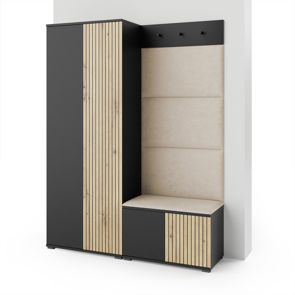 Předsíňová stěna s čalouněnými panely Joey 1 - Černá a Dub Artisan / Tmavá krémová 2302