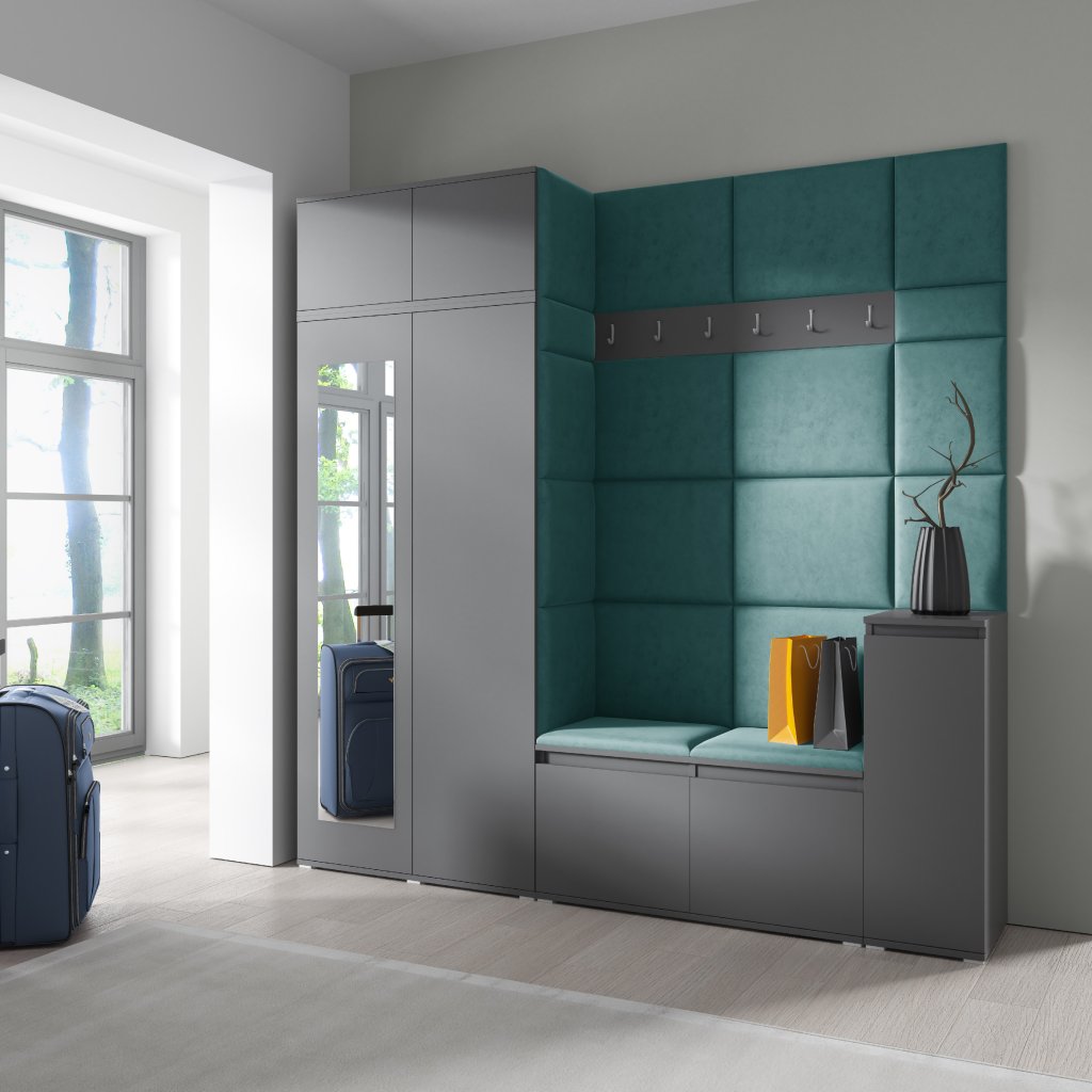 Předsíňová stěna s čalouněnými panely Trinity 26 - Grafit / Tmavá zelená 2328