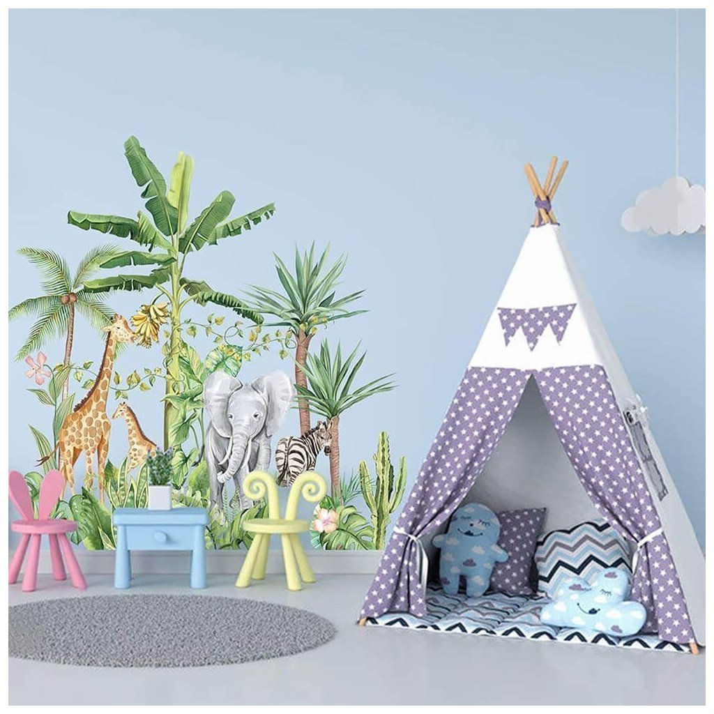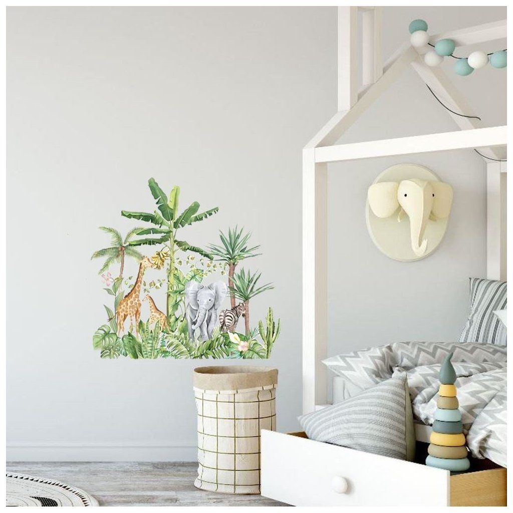 Na samolepce najdete dvě žirafy, zebru a slona. Dále navíc zelený les. Příjemné a reálné barvy. Jednoduché nalepení na zeď.