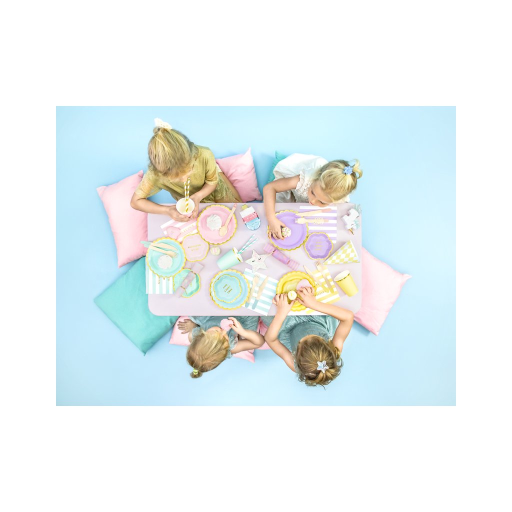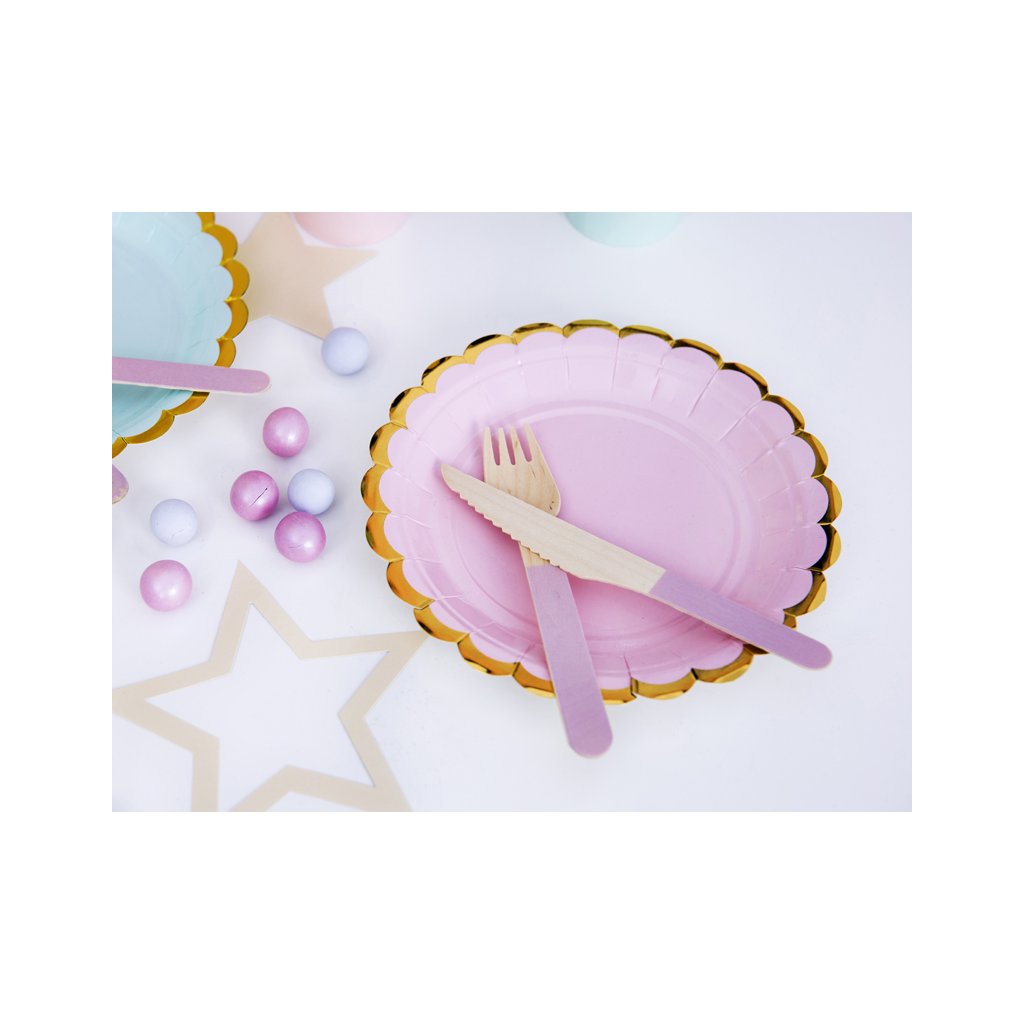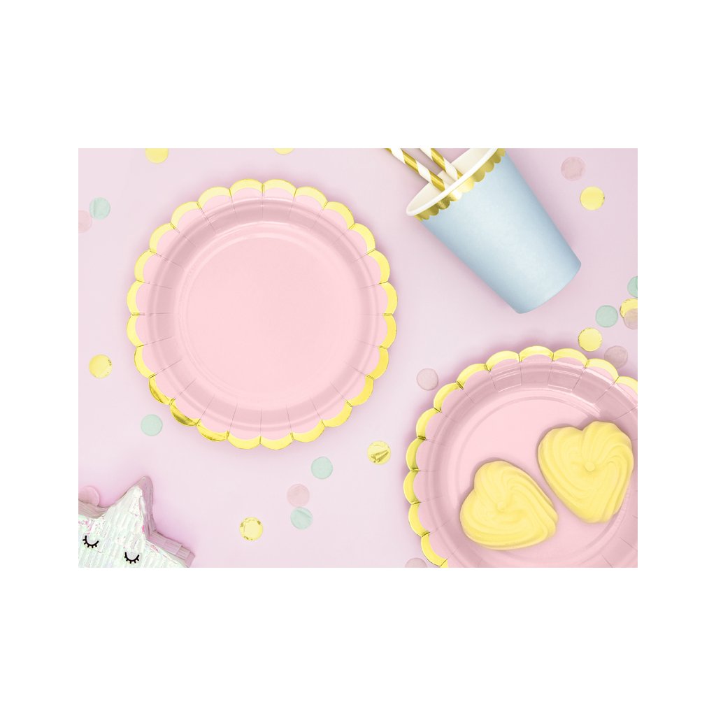 Papírové talířky v růžové barvě se zlatým lemem krásně doladí stůl každé narozeninové oslavy nebo večírku.