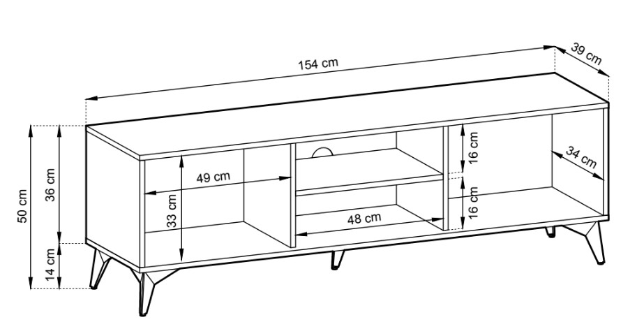 Televizní stolek je široký 154 cm, nabízí dostatek úložného prostoru v podobě dvou skříněk a jedné police uprostřed.