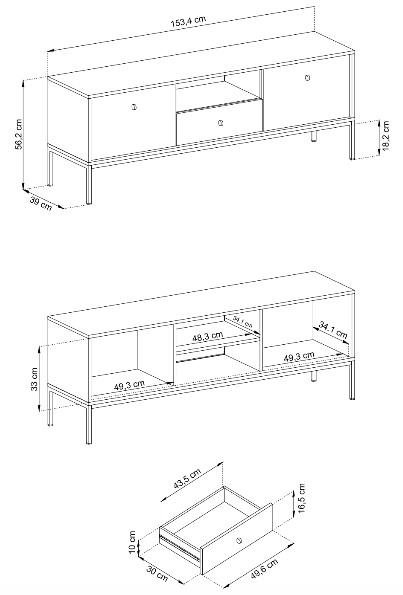 Televizní stolek je široký 154 cm, nabízí dostatek úložného prostoru v podobě tří zásuvek a jedné otevřené police, která může posloužit jako místo pro Váš set-top box, přehrávač nebo herní konzolu.