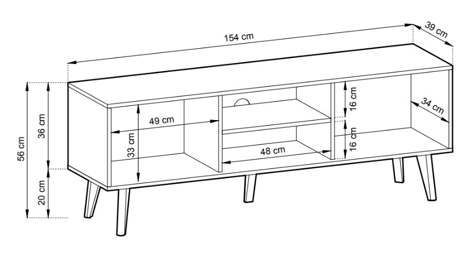 Televizní stolek je široký 154 cm, nabízí dostatek úložného prostoru v podobě dvou skříněk a jedné police uprostřed.