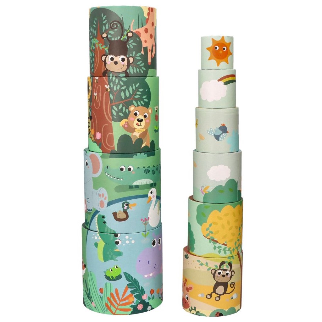 - kelímky lze stavět jeden na druhý, počínaje největším a konče nejmenším, přičemž k sobě ladí vzor džungle
