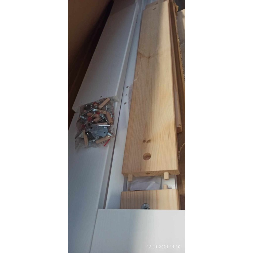 Díly pro sestavení šuplíku, kolečka, spojovací materiál a montážní návod.