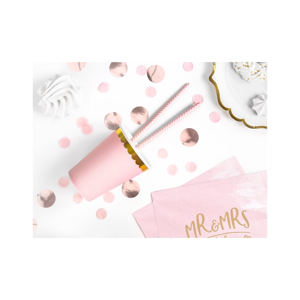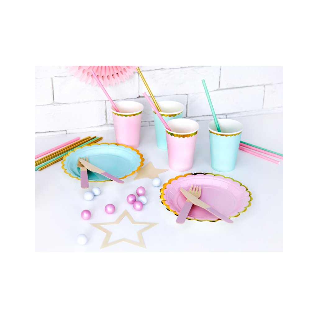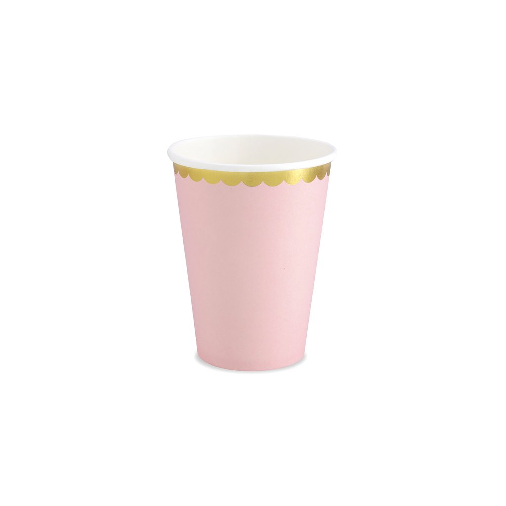 Papírové kelímky v růžové barvě se zlatým lemem krásně doladí stůl každé narozeninové oslavy.