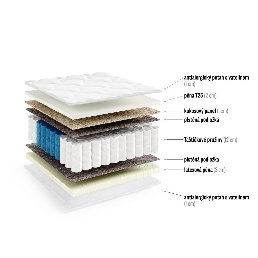 | ? Materiál: | PUR pěna, Kokos, Kapesní pružiny, Latex |