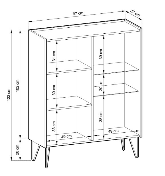 Vitrínová skříň je široká 97 cm, nabízí dostatek úložného prostoru v podobě dvou uzavřených polic v prosklené části. Další úložný prostor vznikl za dvířky, kde se nacházejí dvě police.